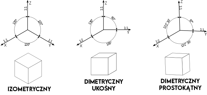 - Anizometria – każda z osi układu prostokątnego tworzy z rzutnią inny kąt i podlega innemu skrótowi.