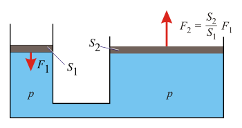 Prosta prasa hydrauliczna zbudowana jest z dwóch połączonych ze sobą cylindrów, które są wypełnione olejem hydraulicznym i zamknięte szczelnymi tłokami. Cylinder roboczy ma zwykle znacznie większą powierzchnię S2 niż cylinder spełniający funkcję pompy S1. Jeśli działamy określoną siłą na tłok pompy F1, to na tłok roboczy działa znacznie większa siła F2. Tłok pompy o powierzchni S1, na który działa siła F1, wywołuje w układzie ciśnienie p.