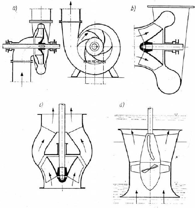 - Śmigłowe (osiowe), kierunek przepływu jest osiowy, a łopatki wirnika przypominają śmigła D