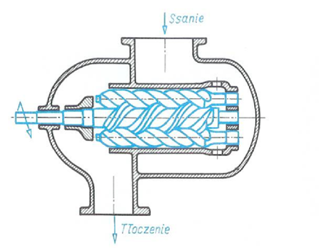 - Śrubowe, modyfikacja pomp zębatych, w których rolę kół zębatych przejmują zazębiające się wirniki śrubowe. Wirniki te podczas obrotu przetłaczają ciecz z komory ssawnej do tłocznej. Wydajność ich może być znacznie większa niż pomp zębatych przy podobnych ciśnieniach oraz nieco niższej sprawności.